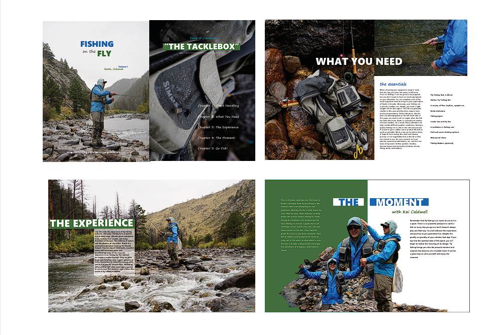Fishing on the Fly is an example of how I would create a publication. To me, a publication or a magazine has to be about something with layers to it. Fishing is a sport with many layers and complexities but can simplified for beginners like me. I wanted to make a guide that would help more people engage in the sport. I wanted to showcase the places and experiences you have while doing it to help get my community excited for fishing season. The purpose of this concept was to create page spreads that used visual language and high-resolution photography for quality results.