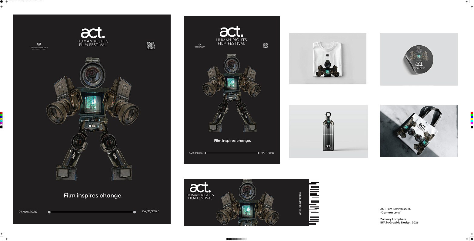 This poster and logo design was for the ACT Human Rights Film Festival. For my design I wanted to create something connecting humanity to filmmaking. In order to do this, I started by deciding the silhouette was going to look like a person. Then, I sketched some conceptual logos, but I didn't think they matched the ACT Human Rights Film Festival. For a while I was puzzled. Then I took some photographs of my cameras at home for inspiration and uploaded them digitally. I made the realization that the cameras could be a part of the logo design, so I took this idea and ran with it. As a motion graphics designer and videographer, I believe people have a special connection to cameras. They help capture moments in time we otherwise wouldn't get to see again and help tell narratives. It's this direct involvement in the process of movie making that make cameras so magical. I wanted to showcase how humanity and cameras work together to create film. To me, film inspires me to be a better human being and get more involved in my community. I put "Film inspires change." on the poster to convey this message in my poster and merchandise proposal.